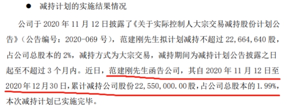值得关注的是,风范股份于2021年1月4日发布的关于实际控制人减持股份结果公告显示,范建刚自2020年11月12日至2020年12月30日,累计减持公司股份2255万股,占公司总股本的1.99%。