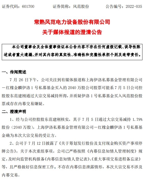 今日,风范股份(601700.SH)发布《关于媒体报道的澄清公告》。公告显示,7月26日下午,公司关注到有媒体报道称上海伊洛私募基金管理有限公司-红橡金麟伊洛1号私募基金买入的2040万股公司股票可能系7月5日公司控股股东范建刚通过大宗交易减持所得,并质疑伊洛1号私募基金买入风范股份股票或存在内幕交易嫌疑。