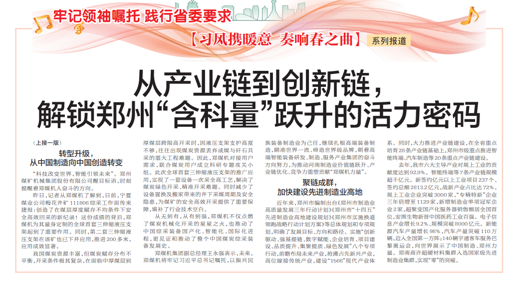 近日,郑州日报在【习风携暖意奏响春之曲】的新闻中这样报道了郑煤机三伸缩液压支架。而在此前,经济日报在其专题报道【步步登高郑煤机】中对郑煤机三伸缩支架也有着墨。