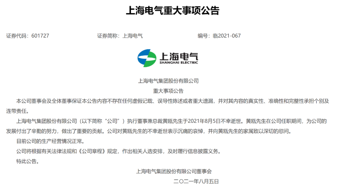 8月5日晚,上海电气( 601727.SH /02727.HK)发布公告称,公司执行董事兼总裁黄瓯先生于当日不幸逝世。