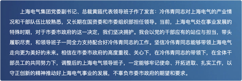 黄瓯当时在会上代表上海电气领导班子发言称:“当前,上海电气处在事业发展的特殊时期,对于市委市政府的这一决定,我们坚决拥护。我会以党的干部应有的站位与担当,带头履职尽责,和领导班子一同,全力支持配合好冷伟青同志的工作。”