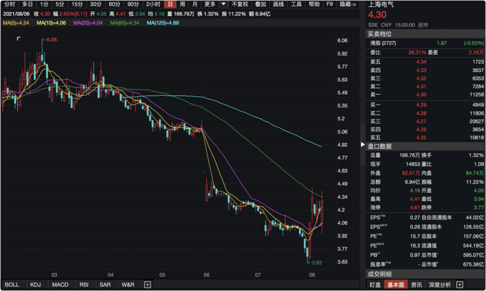 但现在,这家市值曾经上千亿的上市公司,无疑陷入了多事之秋。截止8月6日收盘,上海电气股价为4.30元/股,市值549.6亿元。