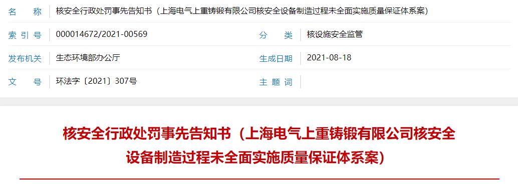 8日18日,生态环境部办公厅网站发布核安全行政处罚事先告知书(环法字〔2021〕307号)披露了上海电气上重铸锻有限公司核安全设备制造过程未全面实施质量保证体系案。