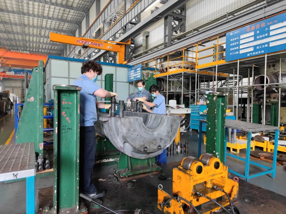 作为上海电力装备重点保供企业,工厂承担着本市多个电厂计划设备检修所需的电力装备生产加工任务,按照计划节点要求,5、6月份有10多个项目需要集中交付,以及许多产品需要按期交付。一面是严峻的疫情形势,紧迫的交货期;一面是紧张的供应链,有限的人手,各种复杂因素相互交织。为了尽可能恢复产能,在复工复产领导小组统一指挥下,全厂各部门高效协同,制造部门以战时状态安排生产作业,汽轮机车间、燃机车间驻厂员工从早8点到晚8点,每天工作12小时。在人手紧张的当下,许多员工发挥一专多能特长,操作多种机床,打通工序断点。同时按照工序每天排摸紧缺人员情况,以专车接人等方式,安排紧缺工序岗位员工快速进厂。