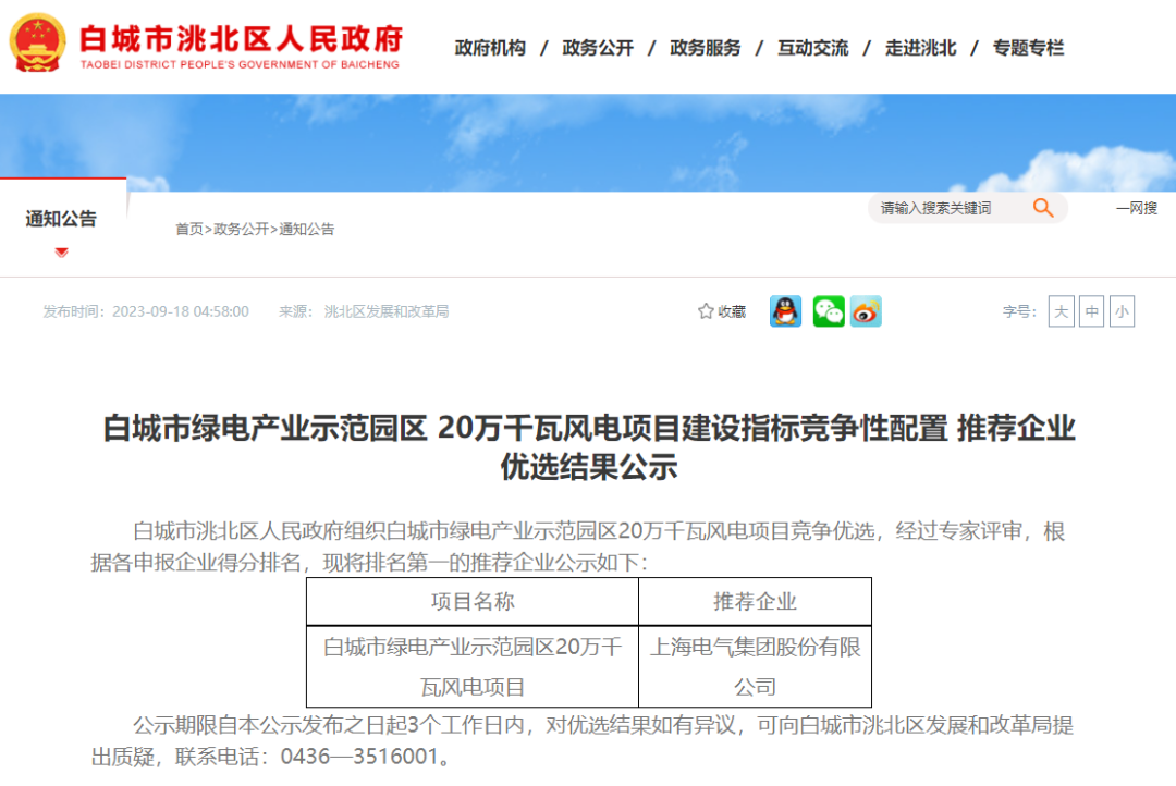 风芒能源获悉,9月18日,吉林省白城市绿电产业示范园区20万千瓦风电项目建设指标竞争性配置推荐企业优选结果公示。排名第一的推荐企业为上海电气。