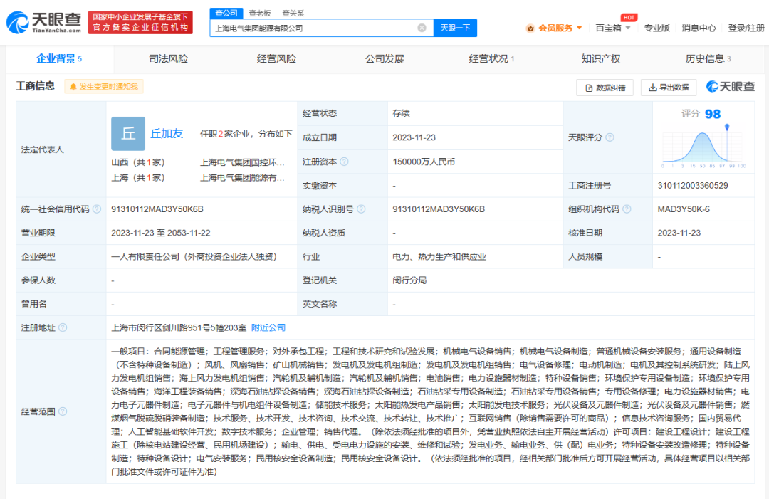 11月23日,上海电气集团能源有限公司成立,法定代表人为丘加友,注册资本15亿人民币,经营范围含合同能源管理、工程管理服务、机械电气设备销售、海上风力发电机组销售、光伏设备及元器件制造、人工智能基础软件开发、民用核安全设备制造等。股东信息显示,该公司由上海电气(601727)全资持股。