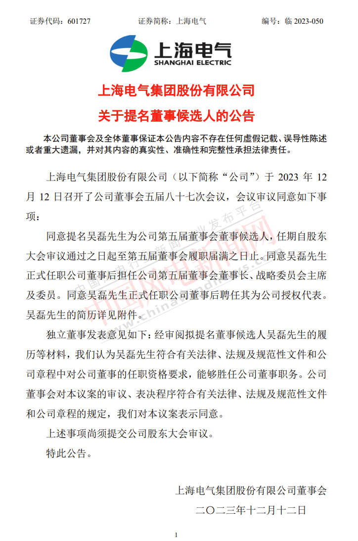 12日晚间,上海电气发布关于提名董事候选人的公告,同意提名吴磊先生为公司第五届董事会董事候选人,任期自股东大会审议通过之日起至第五届董事会履职届满之日止。同意吴磊先生正式任职公司董事后担任公司第五届董事会董事长、战略委员会主席及委员。同意吴磊先生正式任职公司董事后聘任其为公司授权代表。