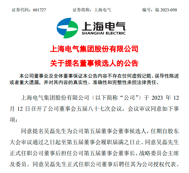 上海电气同日发布公告称,提名吴磊担任董事会董事候选人,其正式上任后,将担任公司董事长一职。
