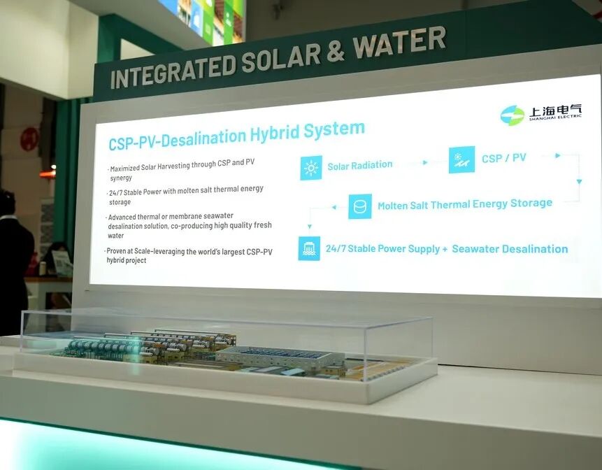 此外,针对中东地区淡水资源短缺、水安全问题,上海电气提供先进的新能源和海水淡化耦合集成方案,利用“光伏+储能+膜法海淡”等多种可再生能源和海淡系统的创新集成,开创绿电直驱“零碳水电联供”新范式,打造绿色低碳、经济高效的新型水电联产示范标杆,助力中东地区经济和社会可持续发展。