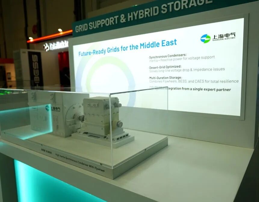 上海电气的“空气储能”“飞轮储能+调相机”等解决方案通过物理储能与电力电子设备的深度融合,为电网提供了调峰能力、毫秒级响应的惯性支撑与快速频率调节能力,有效应对高比例可再生能源并网带来的电网负荷波动、电网频率波动、电压稳定性下降等挑战。空气储能通过压缩机压缩空气储存电能,在电网低负荷时释放能量,实现长时大规模储能效应;飞轮储能利用高速旋转的转子储存动能,可在电网故障时瞬间释放能量;调相机则通过同步电机特性维持电网电压稳定。这些新型储能技术瞄准当地因光伏发电占比过高导致的电网间歇性和波动性等痛点,为高比例可再生能源电网提供了经济高效的稳定性保障方案。