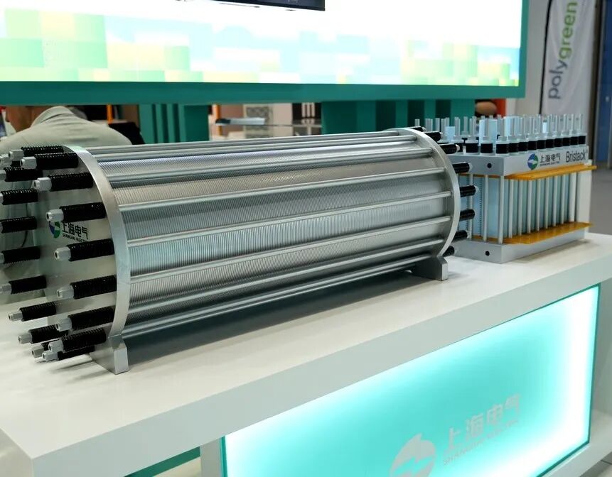 “POWER-TO-X &氢能”展区聚焦氢能产业链的核心环节,重点展示了上海电气自主研发的Bristack?系列电解槽技术。该系列碱性电解槽通过电极材料创新、流场优化设计以及智能负荷分配算法,实现了3.94千瓦时/标方的行业领先能耗水平,较传统技术降低能耗15%。该技术应用于洮南市风电耦合生物质绿色甲醇一体化示范项目,作为全球首个规模化绿氢耦合生物质气化制绿色甲醇项目,通过风电制氢、生物质气化合成甲醇的工艺耦合,将吉林洮南丰富的风能与农业废弃物资源转化为绿色燃料等高价值出口商品。该项目已通过欧盟ISCC EU认证,标志着其碳足迹核算体系符合国际标准,为绿色燃料进入全球市场提供了合规性保障。