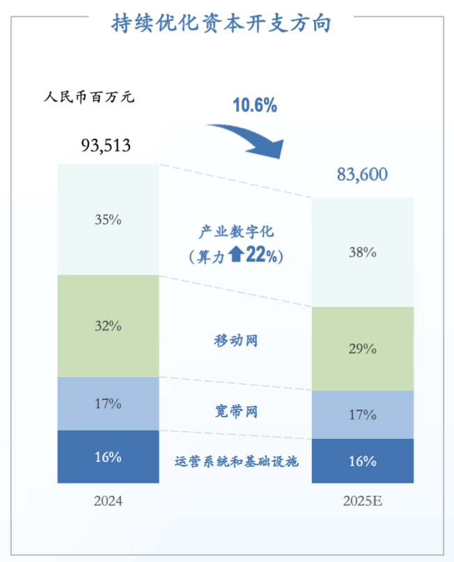 财报显示,中国电信2024年的资本开支为935亿元,同比下降5.4%。面向2025年,中国电信预计资本开支为836亿元,同比下降10.6%。