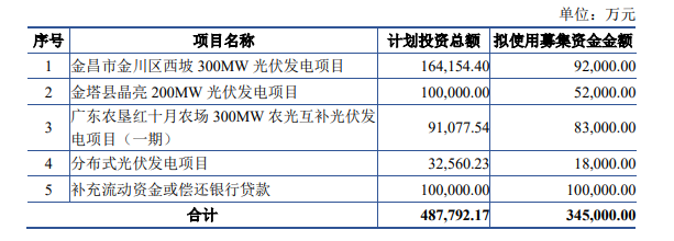 扣除发行费用后的募集资金净额将用于金昌市金川区西坡300MW光伏发电项目、金塔县晶亮200MW光伏发电项目、广东农垦红十月农场300MW农光互补光伏发电项目(一期)、分布式光伏发电项目、补充流动资金或偿还银行贷款。