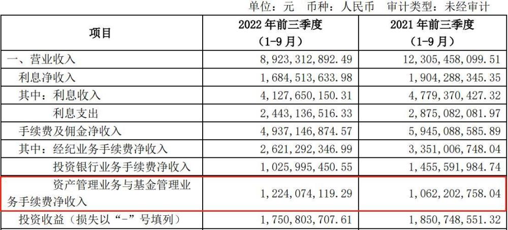 手续费及佣金净收入中,前三季度经纪业务手续费收入26.22亿元,较上年同期下降21.78%;资管与基金业务净收入12.24亿元,较上年同期上升15.24%。
