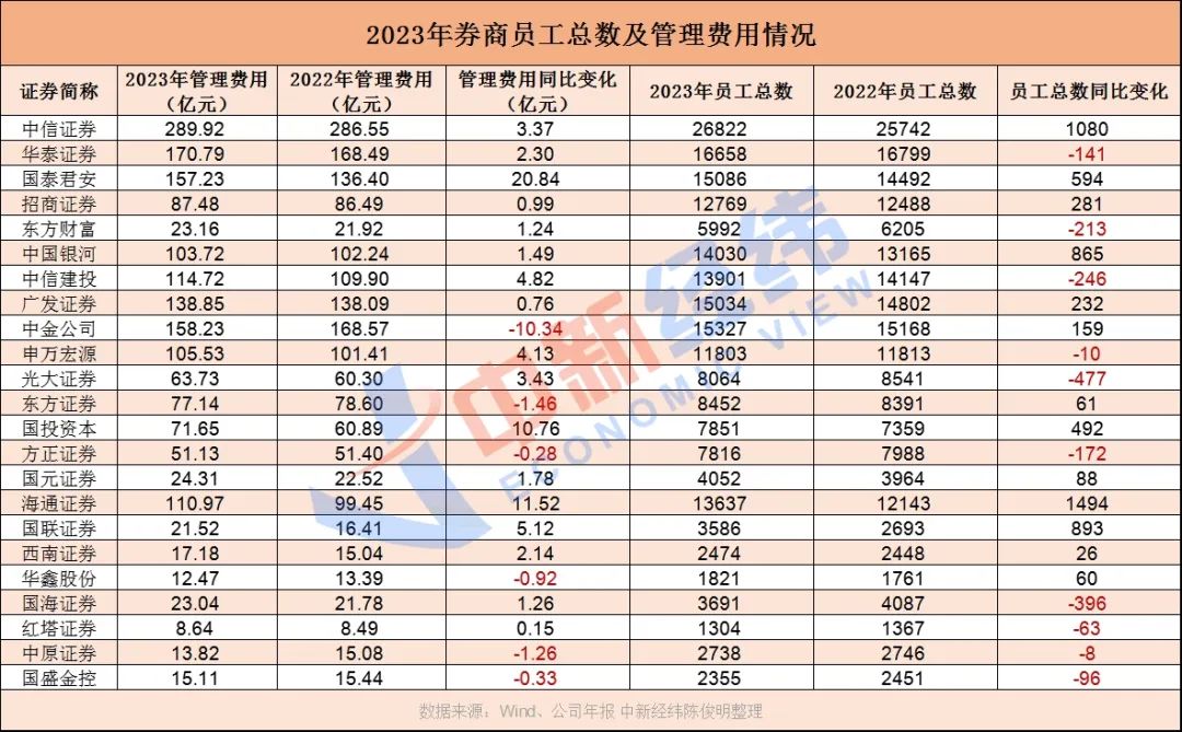 券商龙头中信证券2023年员工数增加1080人,麾下员工增至26822人,但公司管理费用仅小幅增加3.37亿元。具体到薪酬方面,公司2023年应付职工薪酬197.8亿元,较去年198.2亿元出现小幅下降,但考虑到员工数增超千人,人均薪酬降幅超4%。