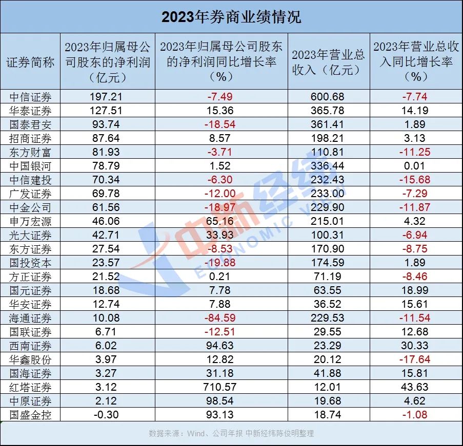 尽管营收、净利同比均降超7%,中信证券仍凭借超600亿元的营收和197亿元的归母净利“遥遥领先”,业绩稳居行业榜首。
