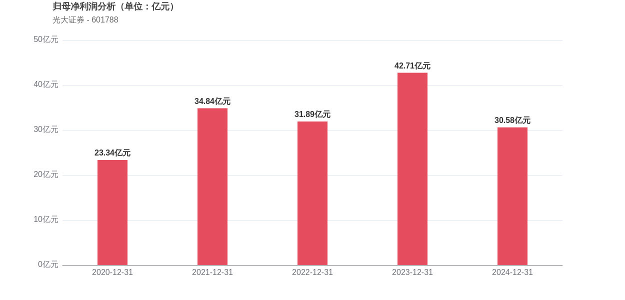 利润角度分析,2020年光大证券实现归母净利润23.34亿元,2024年30.58亿元。利润水平在波动中实现了整体增长。