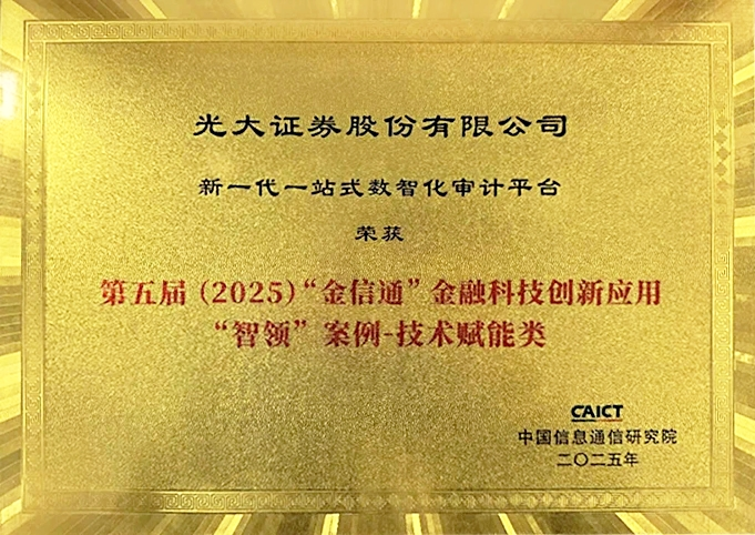 近日,第五届(2025年)“金信通”金融科技创新应用案例评选结果正式发布。该评选聚焦金融科技赋能高质量发展,围绕服务金融“五篇大文章”,遴选具有示范性、创新性和推广价值的优秀应用案例,由中国信通院联合金融科技产业生态各方共同组织开展,具有较高的行业权威性与影响力。光大证券“新一代一站式数智化审计平台”凭借在审计模式创新、全流程数字化重构以及国产信创技术应用等方面的突出表现,成功入选本次金融科技创新应用“智领”案例-技术赋能类。