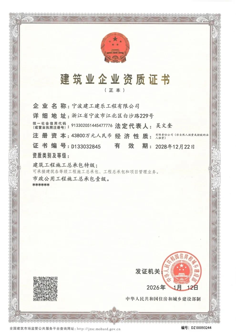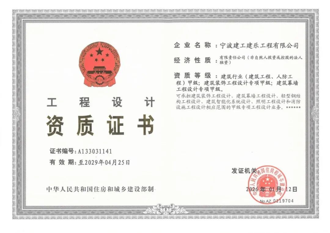 近日,国家住房和城乡建设部网站发布《住房城乡建设部关于核准2026年度第一批建设工程企业资质名单的公告》,宁波建工股份有限公司全资子公司宁波建工建乐工程有限公司成功取得建筑工程施工总承包特级资质,同步获批工程设计建筑行业(建筑工程、人防工程)甲级资质。