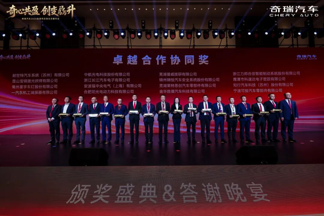 1月16日,以“奇心共盈创变骉升”为主题的奇瑞汽车2026全球供应链生态圈年会在安徽芜湖隆重召开。星宇股份凭借在技术攻坚与协同创新领域的卓越表现,荣膺“卓越合作协同奖”称号。这份荣誉不仅是对星宇技术实力与服务品质的高度肯定,更铭刻着双方携手共进、战略共赢的深厚印记。