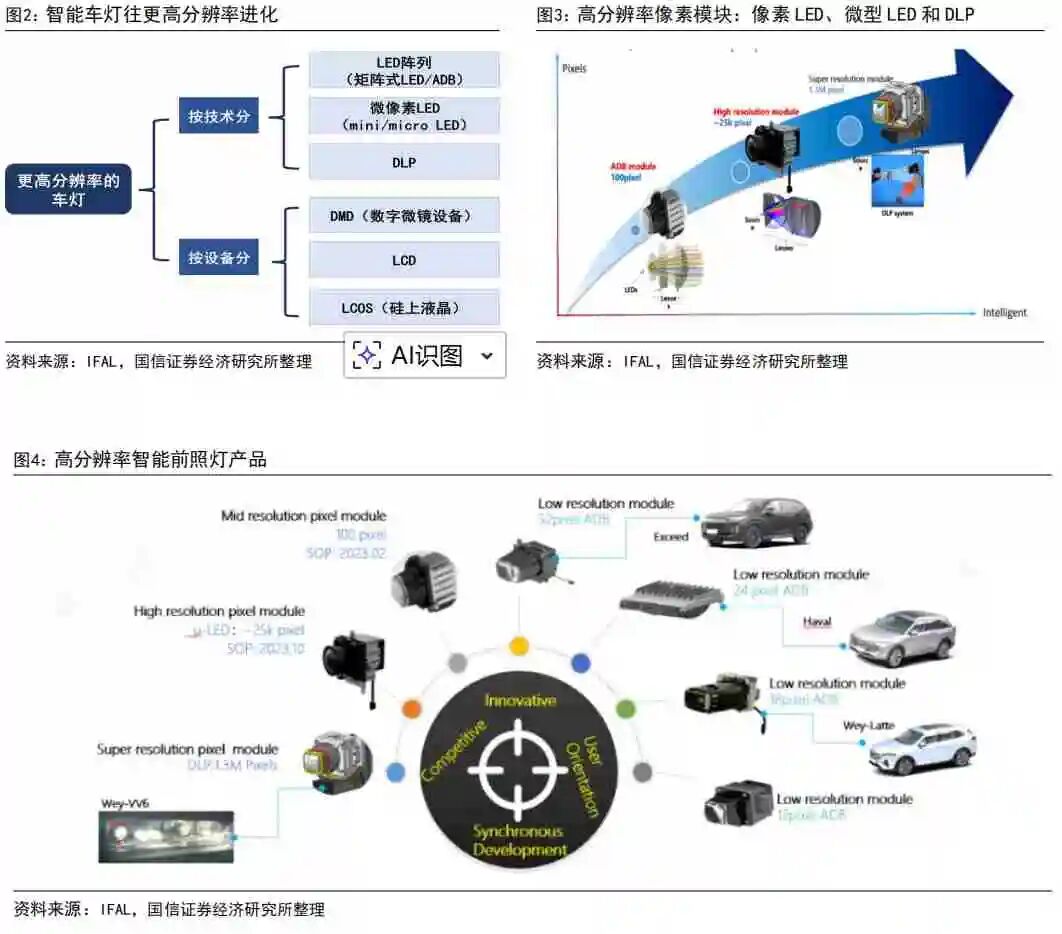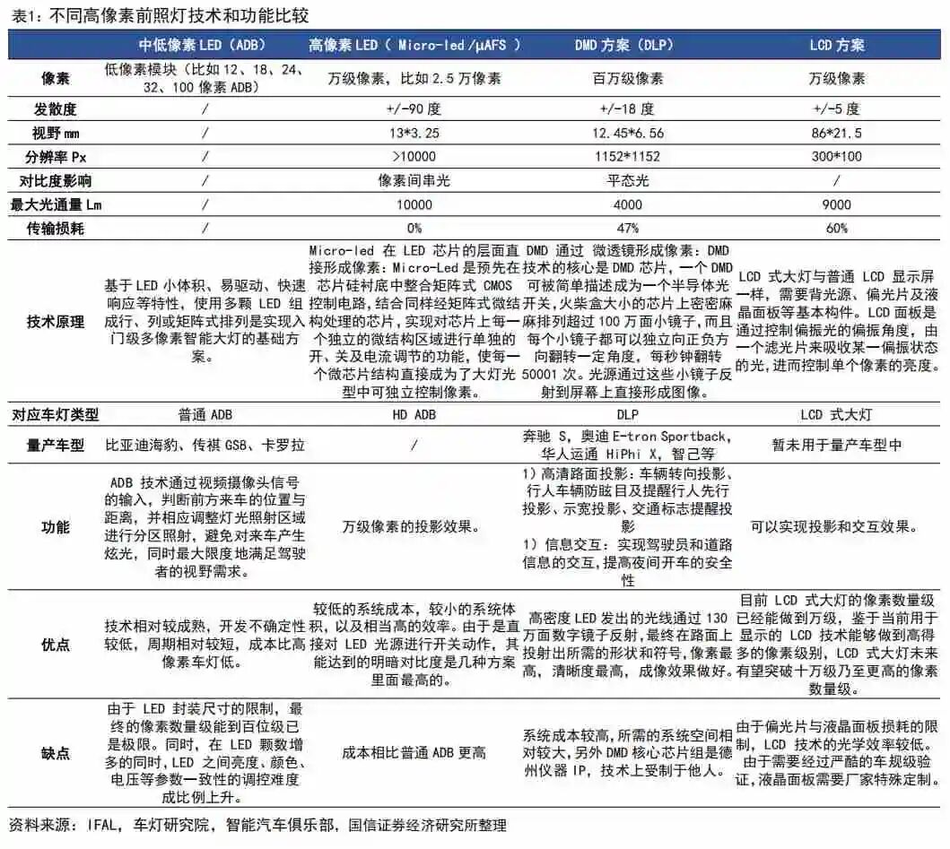 从应用来看,ADB前大灯技术相对较成熟,开发不确定性较低,周期相对较短,成本比高像素车灯低,在中低价位车型已量产应用,代表性车型比如比亚迪海豹、传祺GS8、卡罗拉。由于 LED 封装尺寸的限制,最终的像素数量级能到百位级已是极限。
