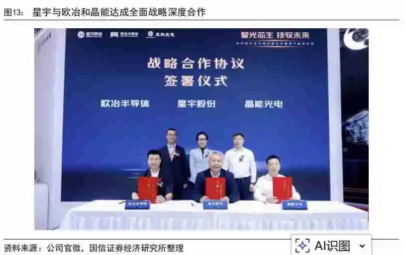 此外,星宇股份加强车灯新技术的开发,在基于 Micro LED 技术的 HD 智能前照灯方面积极布局。2025年4月23日,上海车展现场,星宇股份、欧冶半导体与晶能光电正式签署全面战略合作协议,三方将围绕“全系自主产业链生态”展开深度合作,共同开发iVISION智眸大灯。星宇股份以深厚积淀与垂直一体化制造能力稳居行业头部,欧冶半导体以前沿汽车芯片全栈技术与尖端芯片方案驱动产业革新,晶能光电以创新光源重新定义汽车照明边界。三方达成战略合作协议,整合了产业链上下游优势资源,形成完整自主可控产业链,有助于提升中国汽车照明产业链核心竞争力。iVISION智眸大灯产品是此次合作的核心亮点。它融合了三方在各自领域的技术优势,实现全域ADB远光、首创自闭环算法、国产化供应链、超大角度、超高亮度、超多像素等多项技术指标、行业性能的全面突破,集成全球首发的车灯专用SoC芯片和首款国产Micro LED光源芯片,从算法闭环到光效提升,让每一束光都彰显着本土技术的话语权。2026年1月10日,常州星宇车灯股份有限公司、芯联集成电路制造股份有限公司与湖北九峰山实验室在武汉签署战略合作协议。三方将整合各自在车载照明、芯片制造领域及化合物半导体研发的优势,共同推进Micro-LED车载照明、光通信、AI显示等前沿技术的研发与产业化,携手开创光电技术的新纪元。