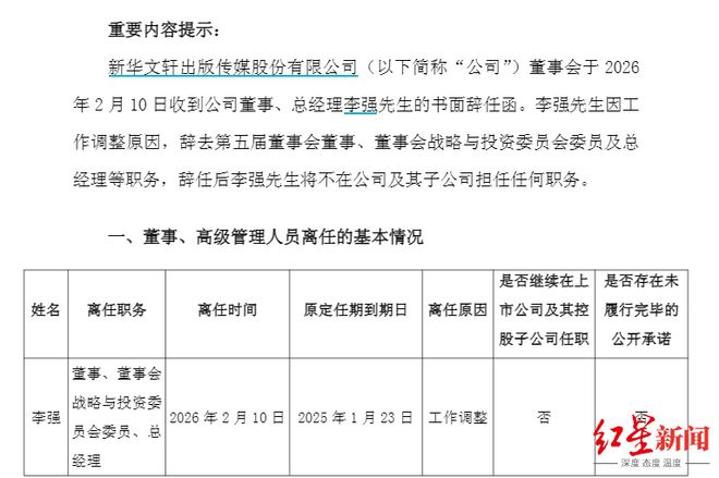 新华文轩(601811.SH)2月10日公告,公司董事会当天收到公司董事、总经理李强的书面辞任函。李强因工作调整原因,辞去第五届董事会董事、总经理等职务,辞任后李强将不在公司及其子公司担任任何职务。