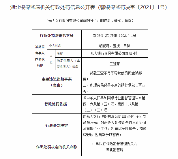 凤凰网财经《银行财眼》6月11日曾报道,银保监会当日开出2张罚单,光大银行襄阳分行因贷资金被挪用等问题被罚款70万元。具体违法违规事实包括:一、贷款三查不尽职导致信贷资金被挪用;二、办理贸易背景不清的银行承兑汇票业务。光大银行襄阳分行责任人胡俊奇被禁止终身从事银行业工作;董斌被予以警告、罚款5万元;黄毅被处以警告。