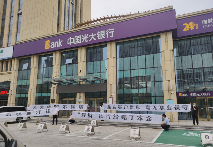 日前,微博账号“滨州大咖”爆料了某企业在光大银行滨州分行门口拉横幅维权事件。据该消息源称,维权企业在光大银行滨州分行购买了被“保证收益”的理财产品却损失本金。滨州分行行长承诺补偿损失后失联,该企业不得已拉横幅维权。网传图片显示,横幅内容为:“泄露客户信息,毫无职业操守”,“光大银行不靠谱”等字句。