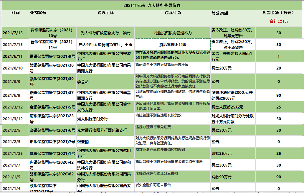 据凤凰网财经《银行财眼》统计,2021年截至目前光大银行被行政处罚14次,合计被罚款421万元。
