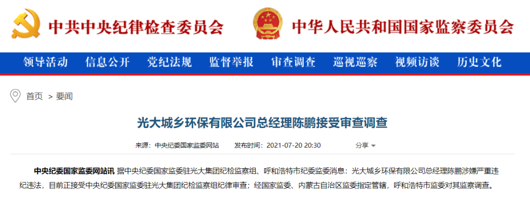 据中央纪委国家监委7月20日消息,光大城乡环保有限公司总经理陈鹏涉嫌严重违纪违法,目前正接受监察调查。