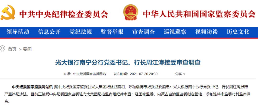 据中央纪委国家监委7月21日消息,光大银行南宁分行党委书记、行长周江涛涉嫌严重违纪违法正接受监察调查。