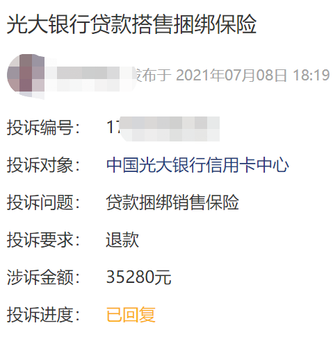 因此,该消费者以“贷款捆绑销售保险”为由投诉了光大银行信用卡中心,涉及金额为35280元。截至目前,未看到光大银行的相关回复,页面显示,光大银行将回复内容“隐藏”。