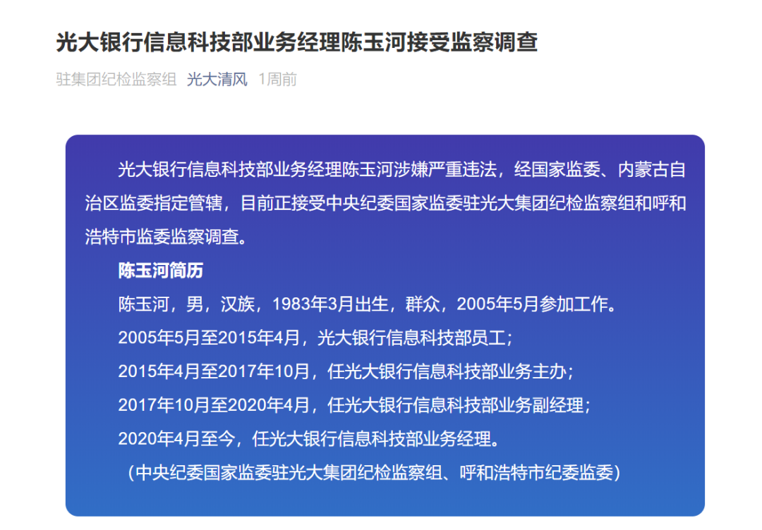 7月22日,据光大清风消息,光大银行信息科技部业务经理陈玉河涉嫌严重违法正接受监察调查。