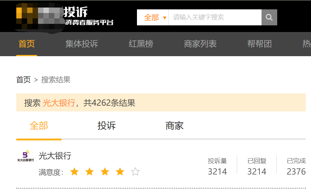 2.在某投诉平台上,“光大银行”有4262条搜索结果,投诉量高达3124条。