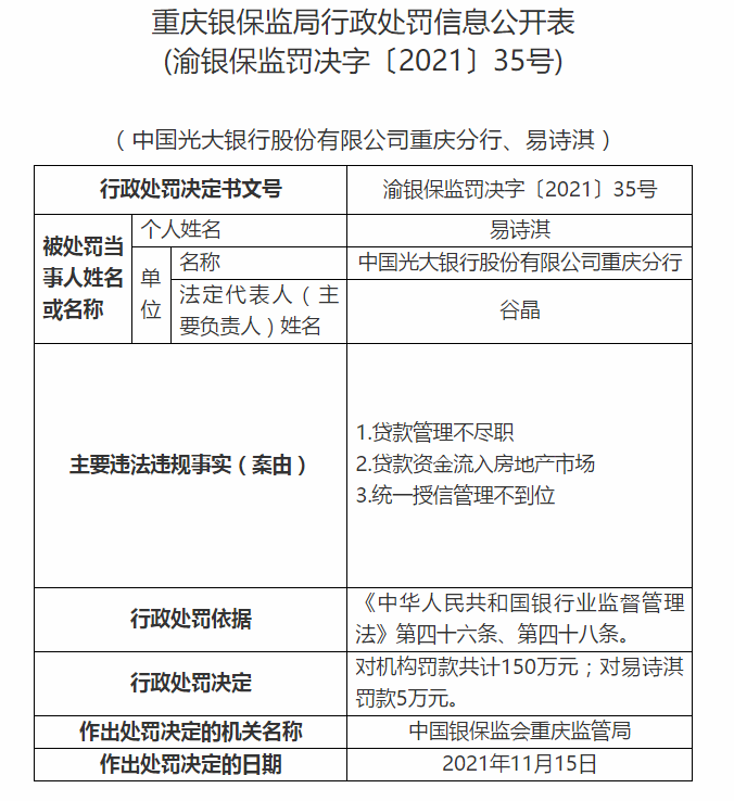 11月23日,据渝银保监罚决字〔2021〕35号,中国光大银行股份有限公司重庆分行、易某淇存在贷款管理不尽职、贷款资金流入房地产市场、统一授信管理不到位等违法违规事实。