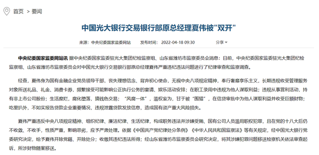 据中央纪委国家监委网站4月18日通报,在被查4个多月后,光大银行交易银行部原总经理夏伟被“双开”。通报称,夏伟不仅生活糜烂、搞钱色交易,还滥权妄为、吃里扒外。