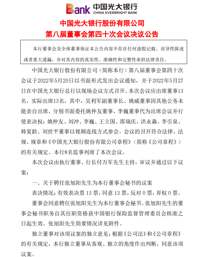今日,光大银行发布公告显示,今日光大银行召开第八届董事会第四十次会议,审议并通过《关于聘任张旭阳先生为本行董事会秘书的议案》。光大银行董事会同意聘任张旭阳为该行董事会秘书。张旭阳的董事会秘书职务自其任职资格获中国银行保险监督管理委员会核准之日起生效。