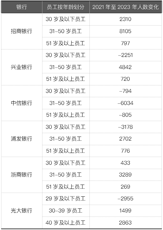 而从31岁至50岁员工的年龄段统计来看,各家银行也都有所增加,只有中信银行减少得特别厉害,减员超过6000人。不过,中信银行的情况也很特殊,2021年至2023年,该行的员工人数整体大幅下滑。所以,中信银行年龄梯队情况并不具备代表性。