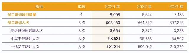 2023年光大银行的员工培训项目数量为8998个,明显高于前两年。并且高级管理层培训人次、中层干部培训人次均有大幅提升。然而在一线员工培训人次方面,相比2022年减少了接近9万人次,相比2021年则减少了接近20万人次。