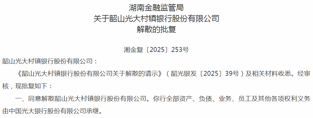 湖南金融监管局近日一纸批复,同意韶山光大村镇银行解散。
