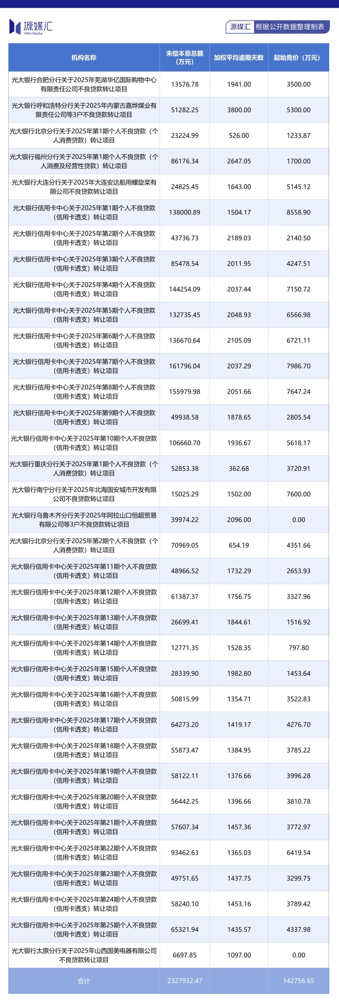银登网数据显示,截至2025年11月14日,光大银行在银登网上挂出了35笔不良贷款转让项目,合计未偿本息总额约为232.79亿元,起始竞价为14.28亿元,仅为总额的6%左右。这种“骨折价”处置背后,是资产质量的严重承压。