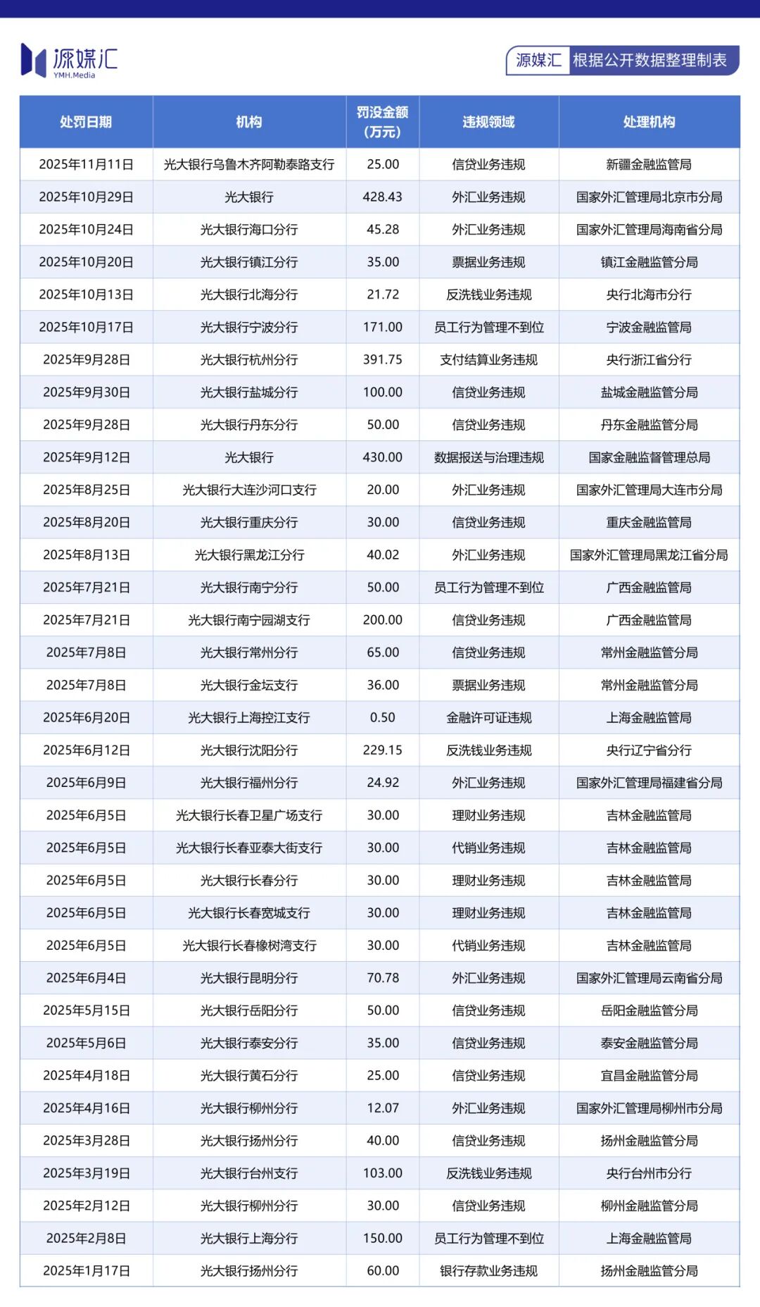 据源媒汇不完全统计,截至2025年11月14日,光大银行至少收到了35张监管罚单(以处罚日期为统计口径),合计罚金3119万元。
