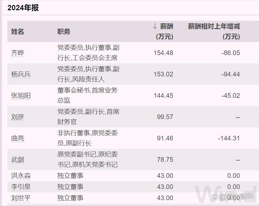 另外,根据2024年年报,高层中齐晔薪酬最高,税前超过154万元,杨兵兵薪酬接近,为153万元,董秘新薪酬也超过140万元;但都比2023年有明显减少。董事长和副董事长不在该行领取薪酬。