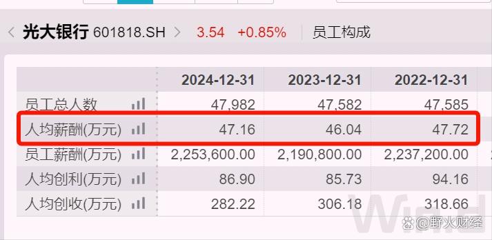 至2024年末,光大银行职工数量接近4.8万人,去年人均创利近87万元,人均税前薪酬47万元,比2023年增加1万元。