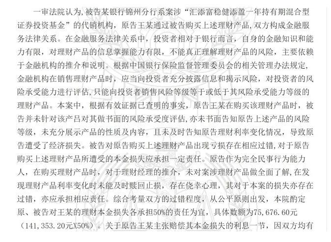 2025年6月26日,锦州市古塔区人民法院作出一审判决,认定双方构成金融服务法律关系。法院认为,银行未充分履行信息披露和风险提示义务,对损失存在过错;同时王某作为完全民事行为能力人,未全面了解产品信息,未及时止损也存在一定过错,故酌定双方各承担50%的责任。判决银行赔偿王某本金损失约7.57万元及相应利息。