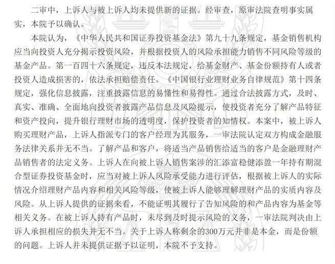 银行还补充称,双方实质法律关系应为财产损害赔偿纠纷而非金融委托理财合同关系,一审法院案由适用错误。针对剩余300万元的性质,银行认为其并非本金而是产品份额,一审法院刻意认定本金概念忽略资产实质已发生变化的事实。