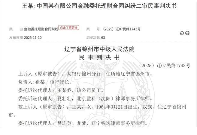 最近,中国裁判文书网公布的一则二审判决书,再次为金融机构代销业务敲响合规警钟。综合判决书及企查查等信息,投资者王某通过光大银行锦州分行理财经理推介,投入600万元购买了某款理财产品,后续赎回部分份额时亏损约14万元。