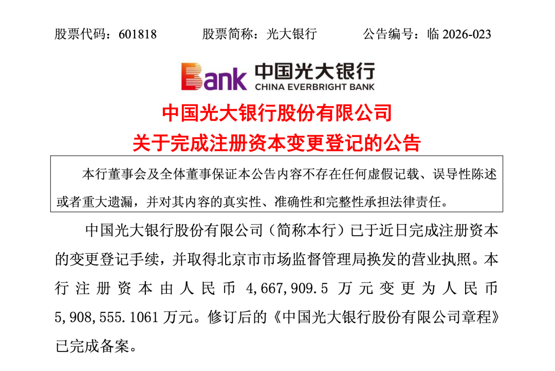 4月8日消息,中国光大银行股份有限公司发布关于完成注册资本变更登记的公告。公告显示,光大银行已于近期顺利完成相关变更登记手续,并取得北京市市场监督管理局换发的营业执照。其注册资本由人民币4,667,909.5万元大幅提升至人民币5,908,555.1061万元,增幅约27%。