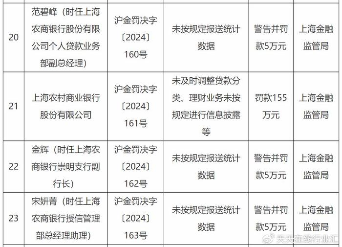 由于“未按规定报送统计数据”,时任沪农商行崇明支行副行长金辉、授信管理部总经理助理宋妍菁,个人贷款业务部副总经理范碧峰分别被处以警告并罚款5万元处罚。